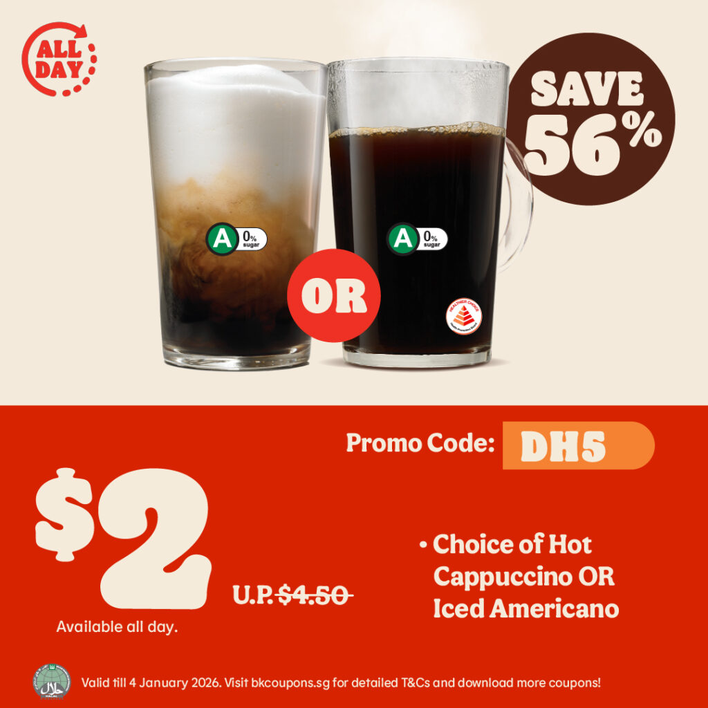 Start your day or fuel your afternoon with the smooth, creamy goodness of a robust Hot Cappuccino or a refreshing Iced Americano. Brewed fresh and perfect for a pick-me-up. Now just $2. Save 56% and sip your way to a better day only at BK.