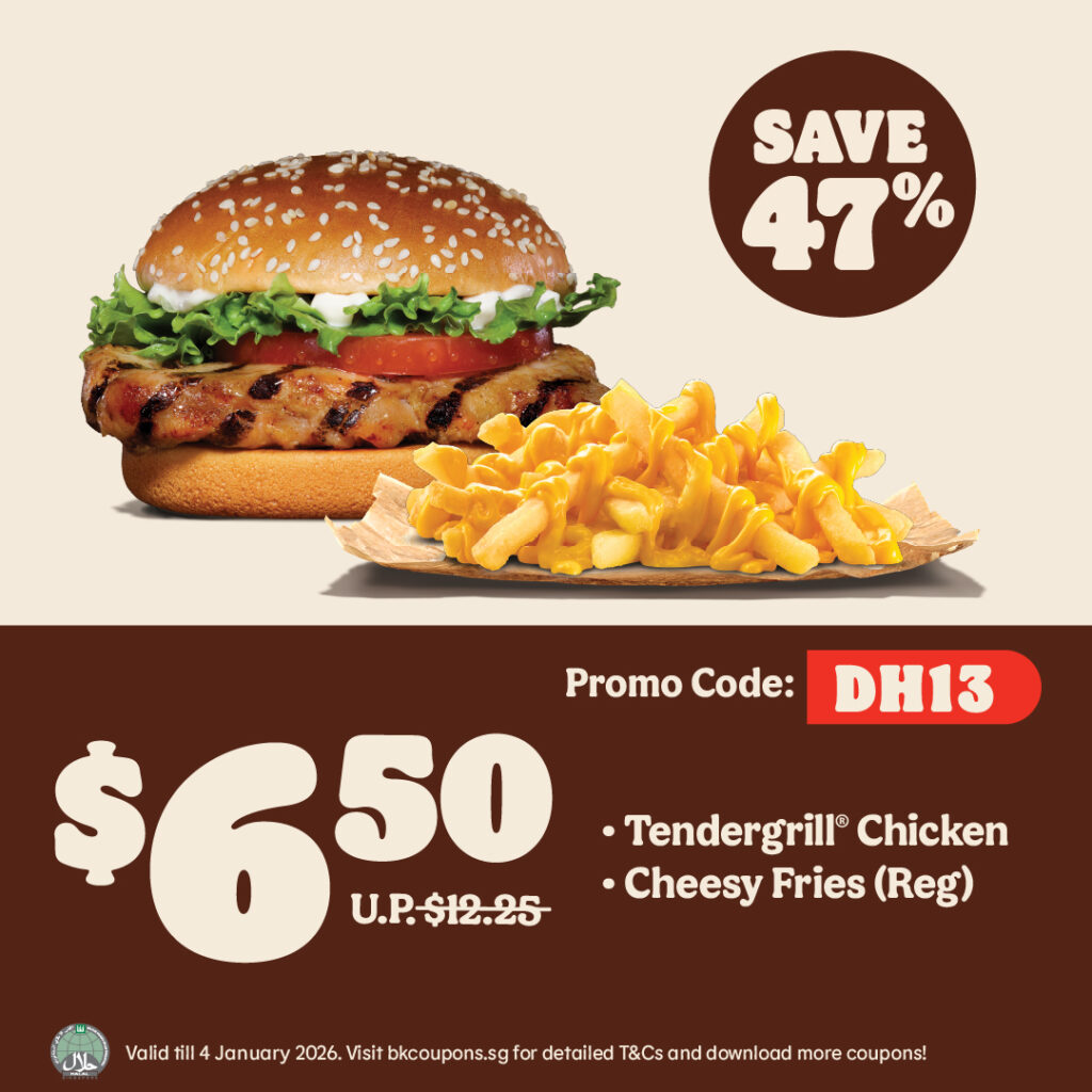 Looking for a satisfying comfort meal? Get the smoky, juicy Tendergrill® Chicken Burger paired with rich, Cheesy Fries (Reg). It’s warm, filling, and ready when you are. Yours for just $6.50 with 47% OFF. Treat yourself to this BK classic combo today by redeeming this coupon.
