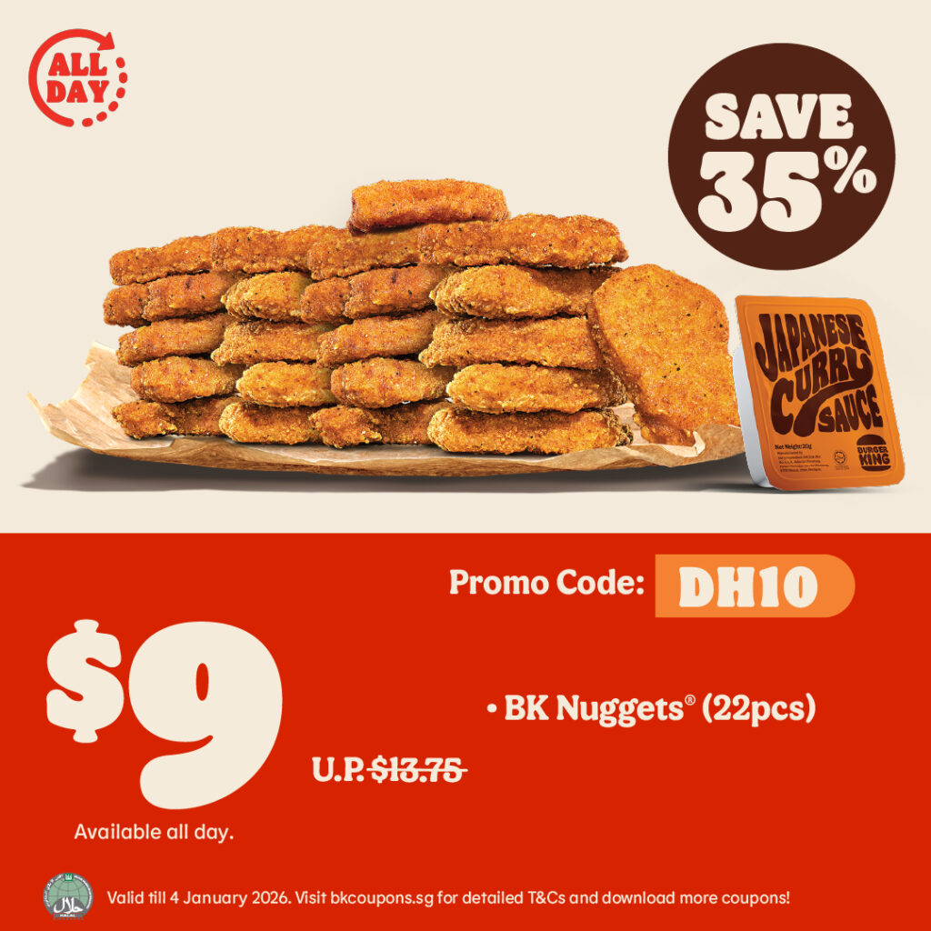 Snack cravings? Satisfied. This party-size box of crispy BK Nuggets (22pcs) is great for sharing, snacking, or not sharing at all. Juicy, golden, and ready for dipping. Use this coupon and score it all for just $9 and enjoy 35% OFF your next big bite.